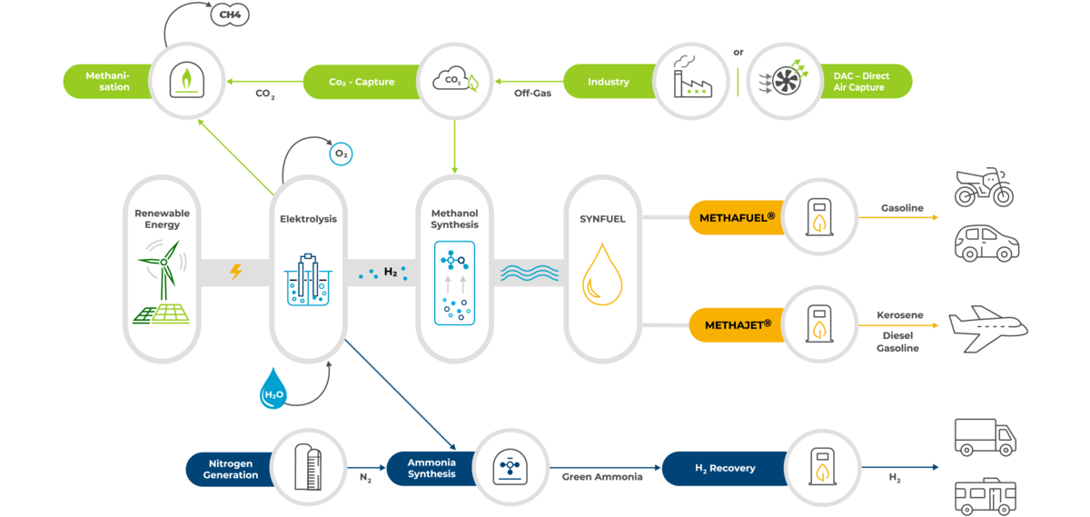 Since 2008 we have been working successfully on the development and application of our own technologies for climate-neutral fuels on the basis of methanol. The advantage lies in the cost-effective production of methanol in regions with favorable energy conditions, use of existing infrastructure for its transportation and the conversion into e-fuels at competitive costs. This will help immediately to reduce CO2 emissions from fossil fuels.